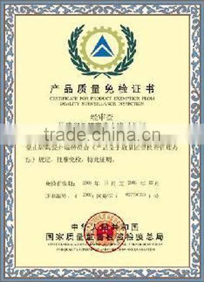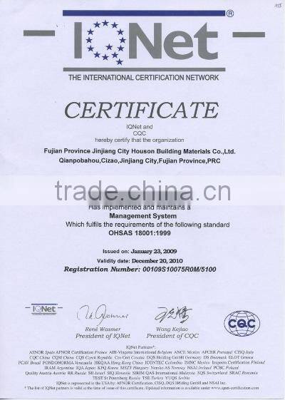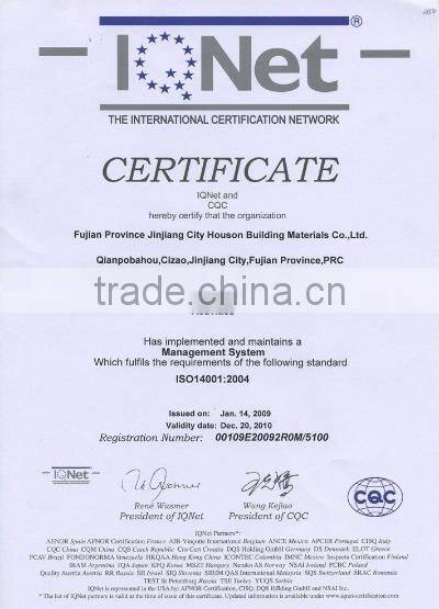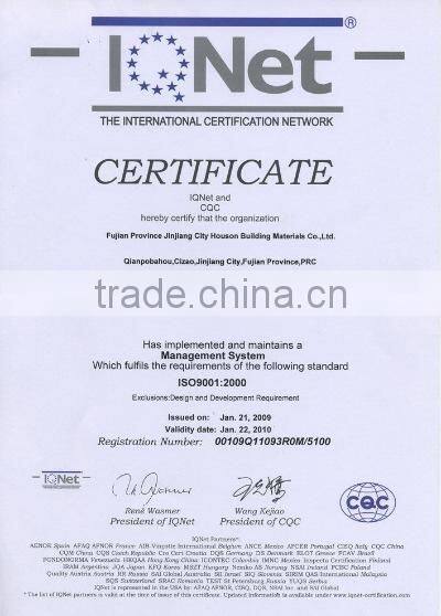 In 1996, the company attained "International Standard Products Certification", we has made and implemented its quality policy so that it can keep conformity with the international conventions in administration, quality and services. In 2001 the company passed ISO9001: 2000 the verification of quality administration system. In 2003, we are very honored to confer the most authorized certification "NATIL Exemption Inspection Products", and also we are the first approved to pass the certification "China Compulsive Certification", and we got other certifications like " Chinese well-known good product", "Green building materials certificate".